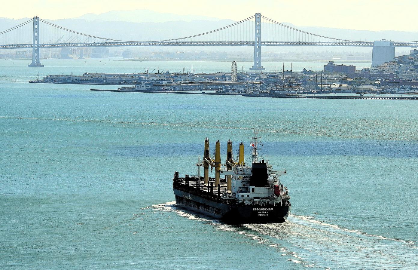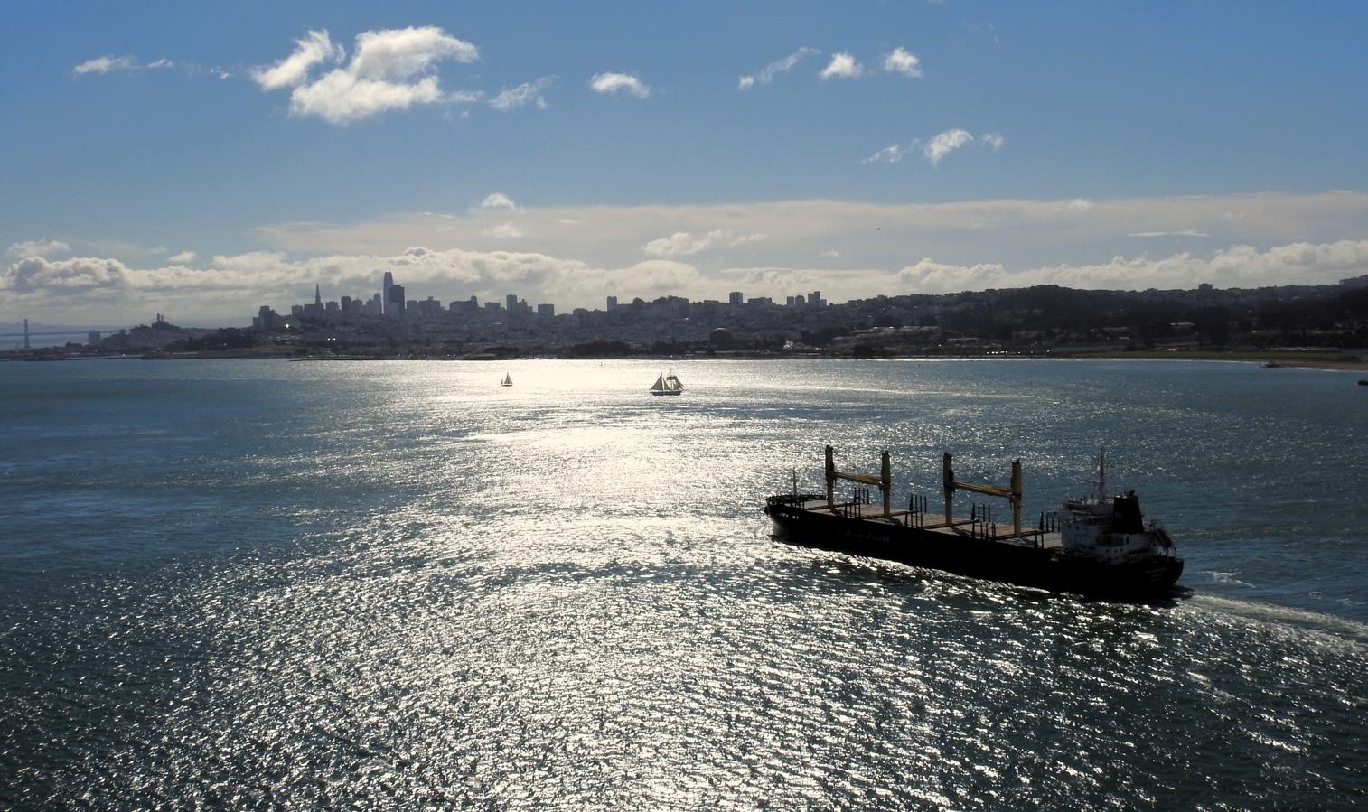 Empty Container Ship Beneath the City Skyline, Golden Gate National Recreation Area – San Francisco, CA