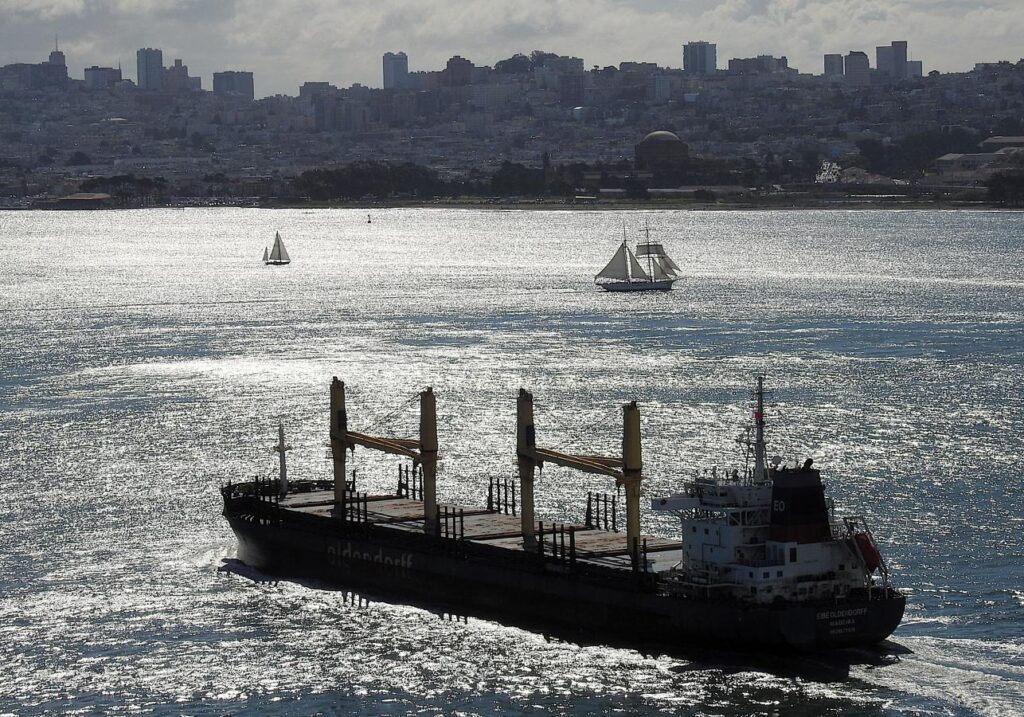 Empty Container Ship Beneath the City Skyline, Golden Gate National Recreation Area – San Francisco, CA